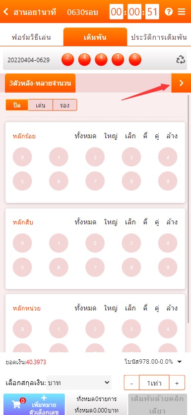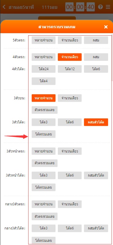 2.คลิกที่ ปุ่มสีส้มที่เป็นสัญลักษณ์ > ตามรูป เพื่อเลือกประเภทการแทง