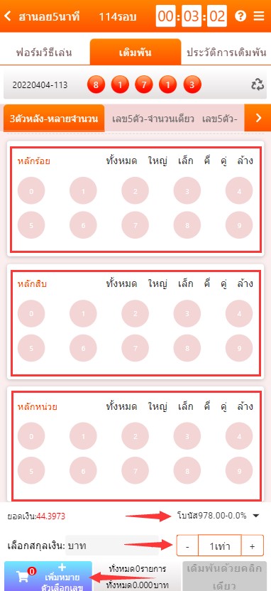 3. เลือก ตัวเลขที่ต้องการ ให้ครบทุกหลัก รวมทั้งเลือกอัตราจ่ายและจำนวนเงินที่ต้องการ จากนั้นกด ปุ่มสีฟ้า เพื่อเพิ่มโพย