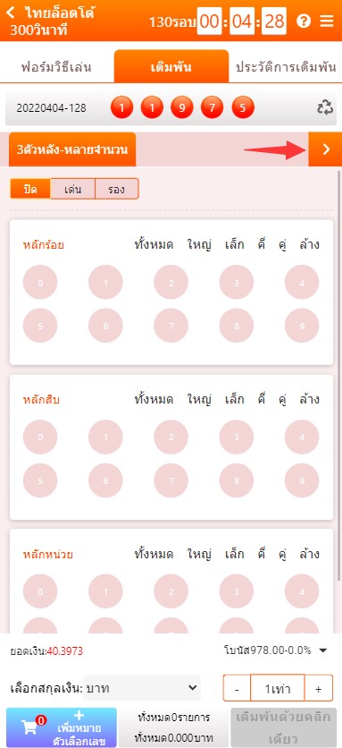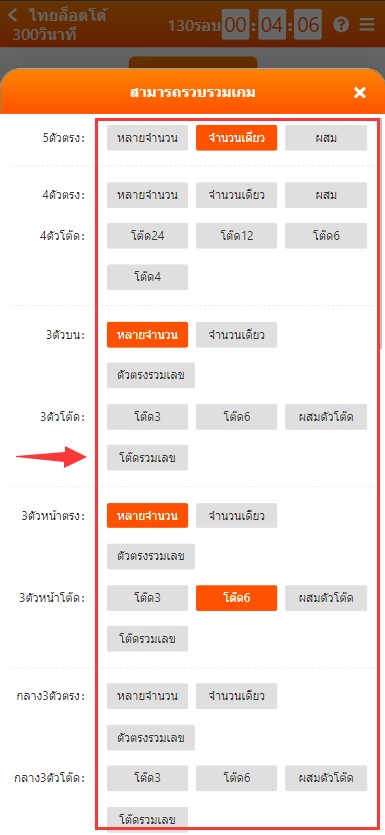 2. คลิกที่ ปุ่มสีส้มที่เป็นสัญลักษณ์ > ตามรูป เพื่อเลือกประเภทการแทง