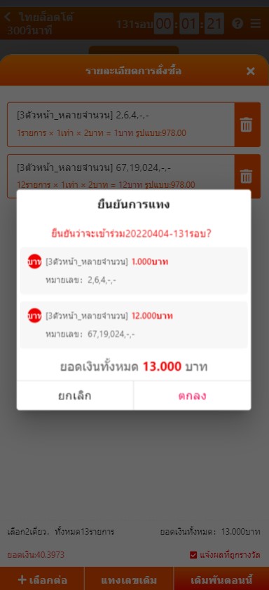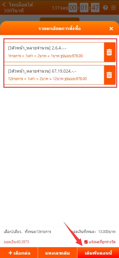 4. คลิกที่ปุ่มสีฟ้าและตรวจสอบรายการแทง จากนั้นกด “เดิมพันตอนนี้”
