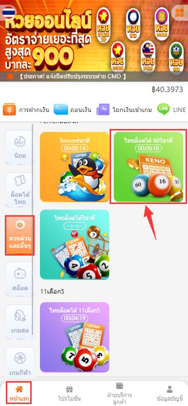1. ไปที่ “หน้าแรก” เลือก “หวยด่วนและอื่นๆ” จากนั้นเลือก “ไทยล็อตโต ้60 วินาที”