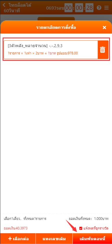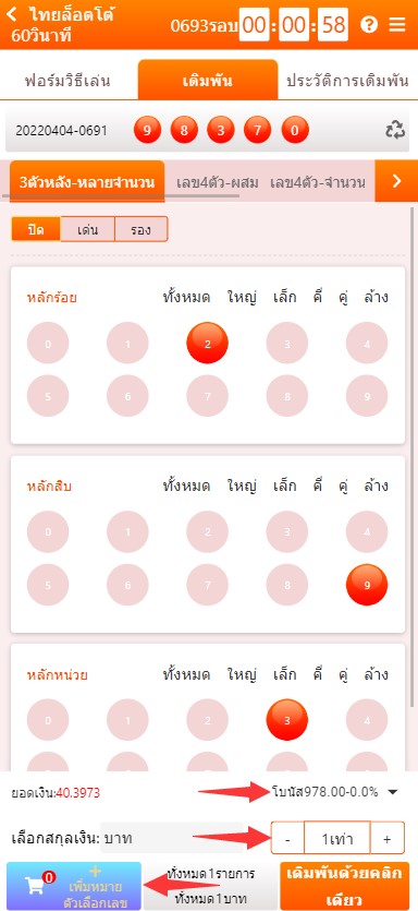 3. เลือก ตัวเลขที่ต้องการ ให้ครบทุกหลัก รวมทั้งเลือกอัตราจ่ายและจำนวนเงินที่ต้องการ จากนั้นกด ปุ่มสีฟ้า เพื่อเพิ่มโพย