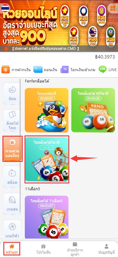 1. ไปที่ “หน้าแรก” เลือก “หวยด่วนและอื่นๆ” จากนั้นเลือก “ไทยล็อตโต้วินาที”
