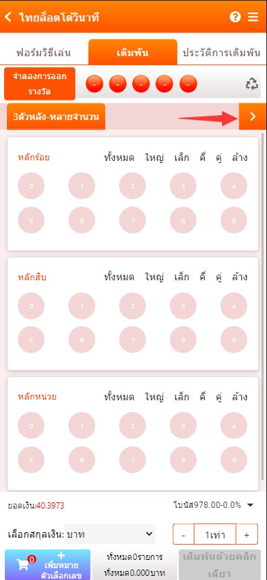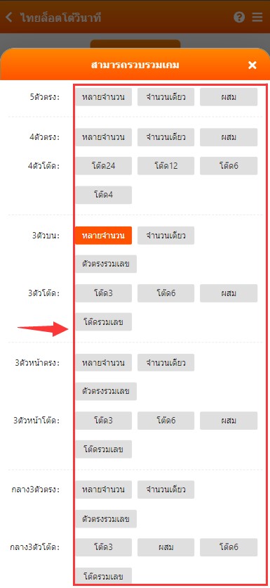 2. คลิกที่ ปุ่มสีส้มที่เป็นสัญลักษณ์ > ตามรูป เพื่อเลือกประเภทการแทง