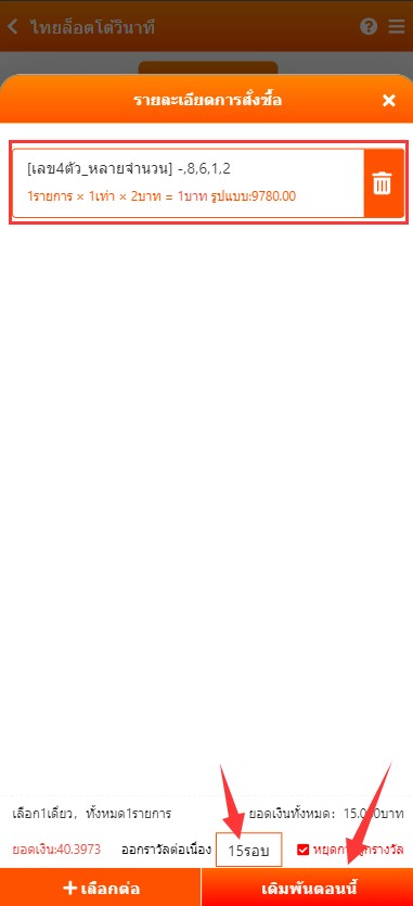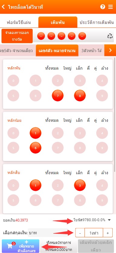 3. เลือก ตัวเลขที่ต้องการ ให้ครบทุกหลัก รวมทั้งเลือกอัตราจ่ายและจำนวนเงินที่ต้องการ จากนั้นกด ปุ่มสีฟ้า เพื่อเพิ่มโพย