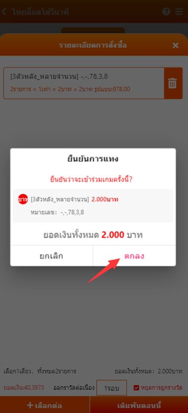 5. คลิก “ตกลง” เพื่อยืนยันการแทง จะมีป๊อปอัพเด้งขึ้นว่า “เดิมพันสำเร็จ” ถือเป็นการเสร็จสิ้นการซื้อหวย