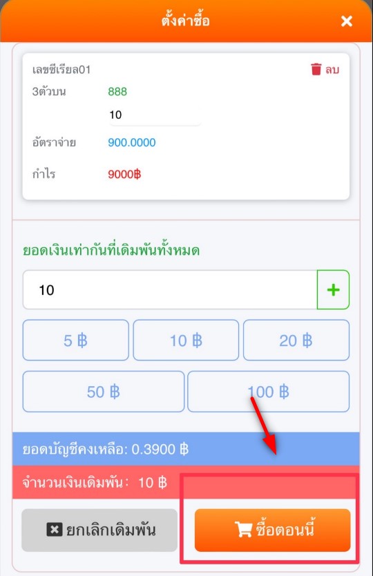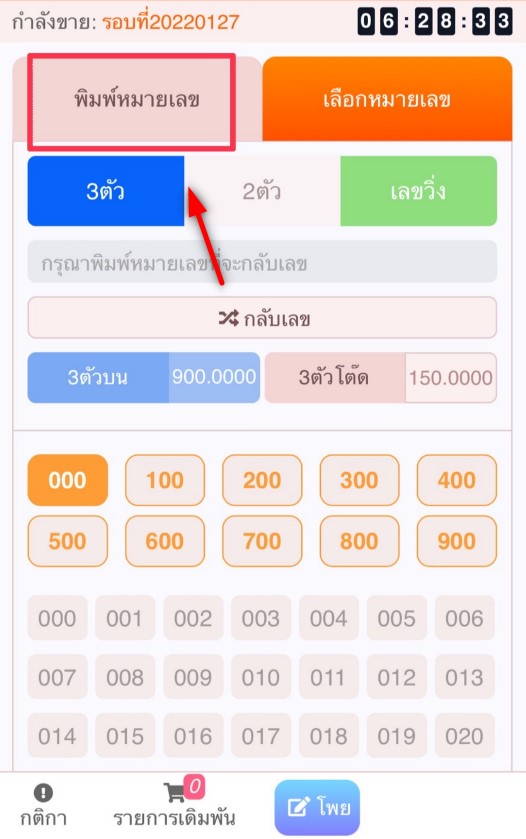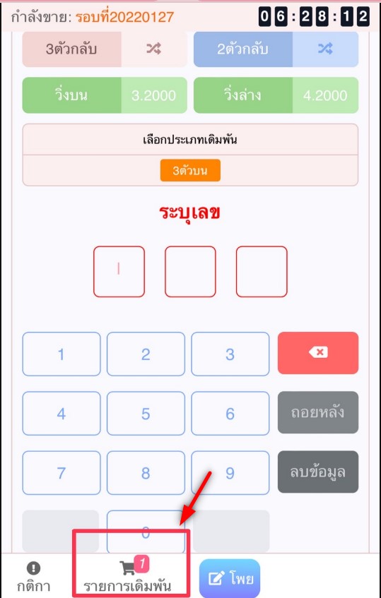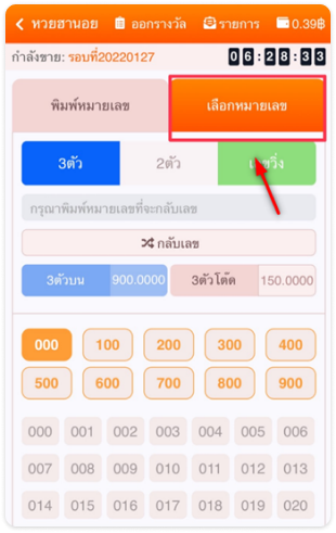 4. เลือกหมายเลขที่ต้องการ ซึ่งเลขที่ถูกเลือกซื้อจะย้ายไปอยู่ที่รายการเดิมพัน